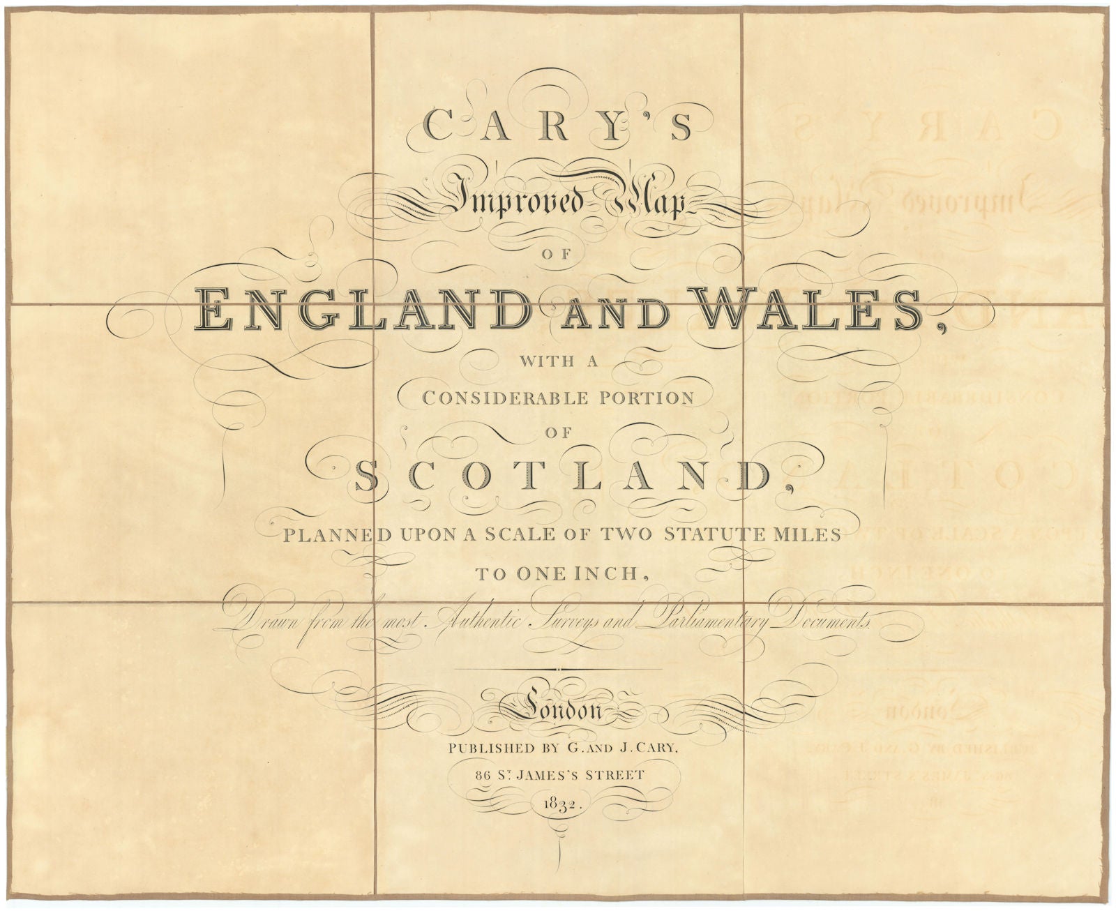 '"Cary's Improved Map of England and Wales, with a considerable portion of Scotland, planned upon a scale of two statute miles to one inch, drawn from the most Authentic Surveys and Parliamentary Documents", Published by G. and J. Cary, 86 St James's Street, London'