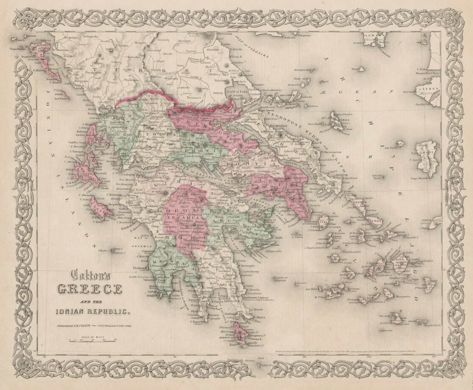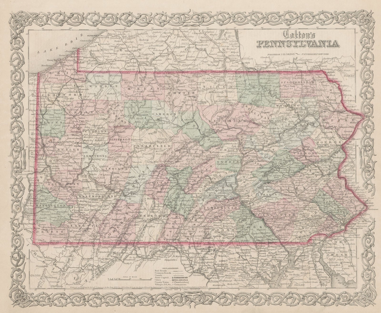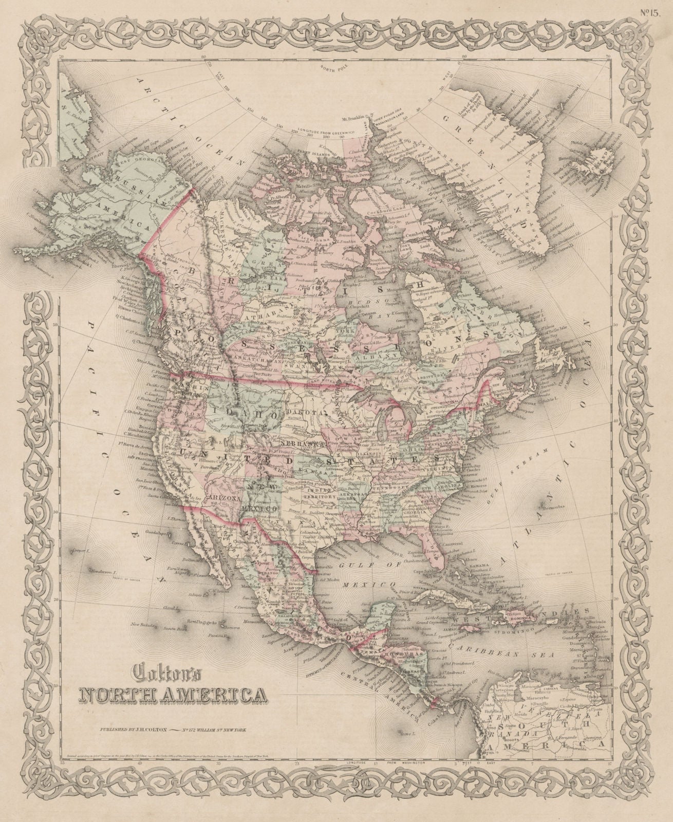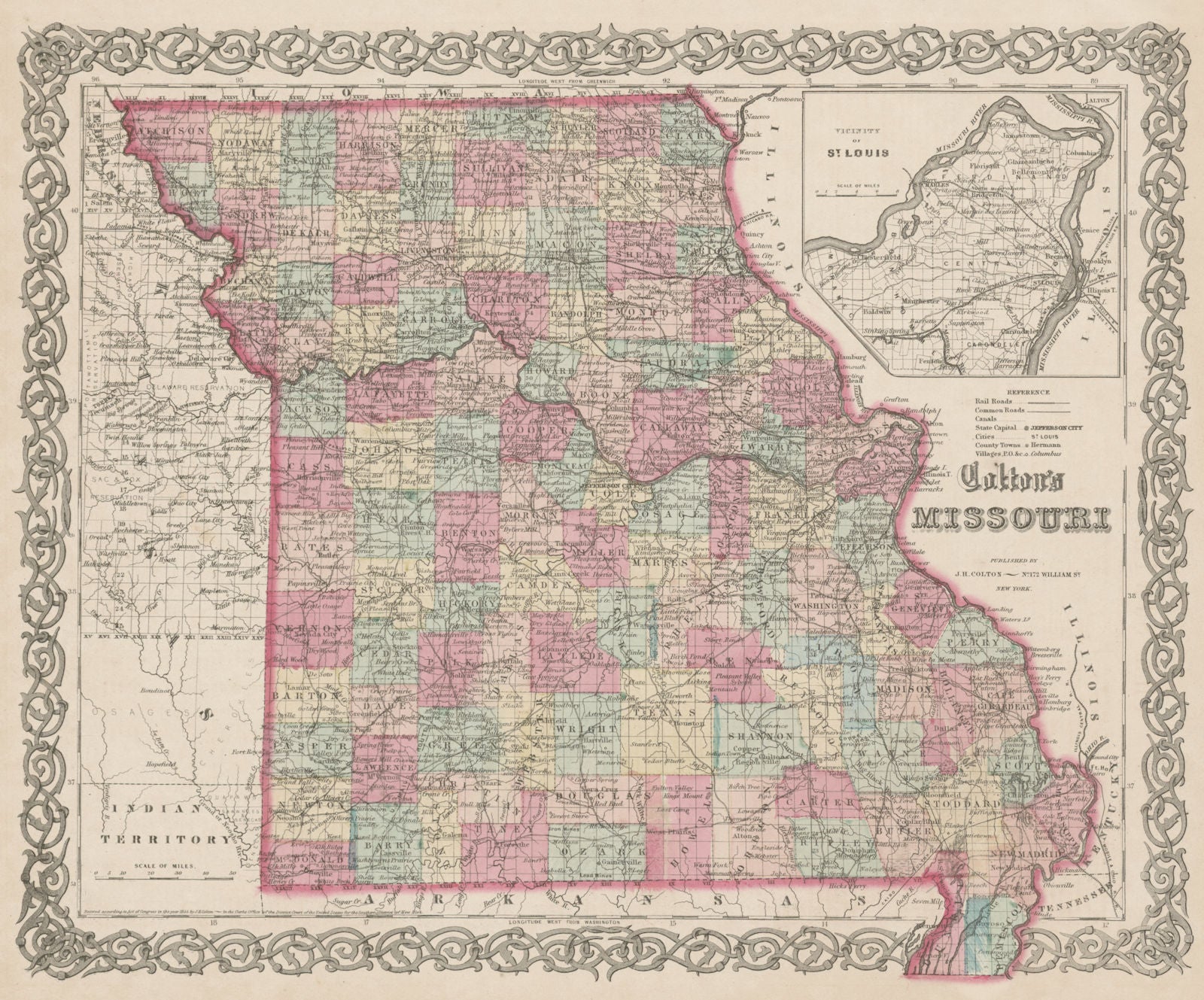 J.H. Colton (1800–1893) was one of the most influential American map publishers of the 19th century, active from 1831 to 1890. Based in New York, he began by licensing maps from other cartographers but soon developed a distinctive house style. His work is noted for a recognisably American mid-19th century aesthetic: fine steelplate engraving, rich hand colouring in a distinctive palette, and ornate decorative borders. Colton’s firm played a pivotal role in documenting the dramatic transformation of the United States during a period of rapid territorial expansion—following the Louisiana Purchase, the annexation of Texas, the Mexican–American War, and the admission of new states. His Atlas of the World (1855–56) and the widely circulated General Atlas (1857–88) recorded these changes in near real time, frequently updating county lines, political boundaries, and railroads. Particularly notable are Colton’s maps of the Trans-Mississippi West—depicting evolving territories like Kansas, Nebraska, Indian Territory, Utah, and New Mexico—where borders shifted amid migration, conflict, and development. His Condensed Octavo Atlas of the Union (1864), published during the Civil War, captured a nation still defining its political and physical identity. Today, his maps are valued both for their beauty and as vivid historical records of a continent in flux.