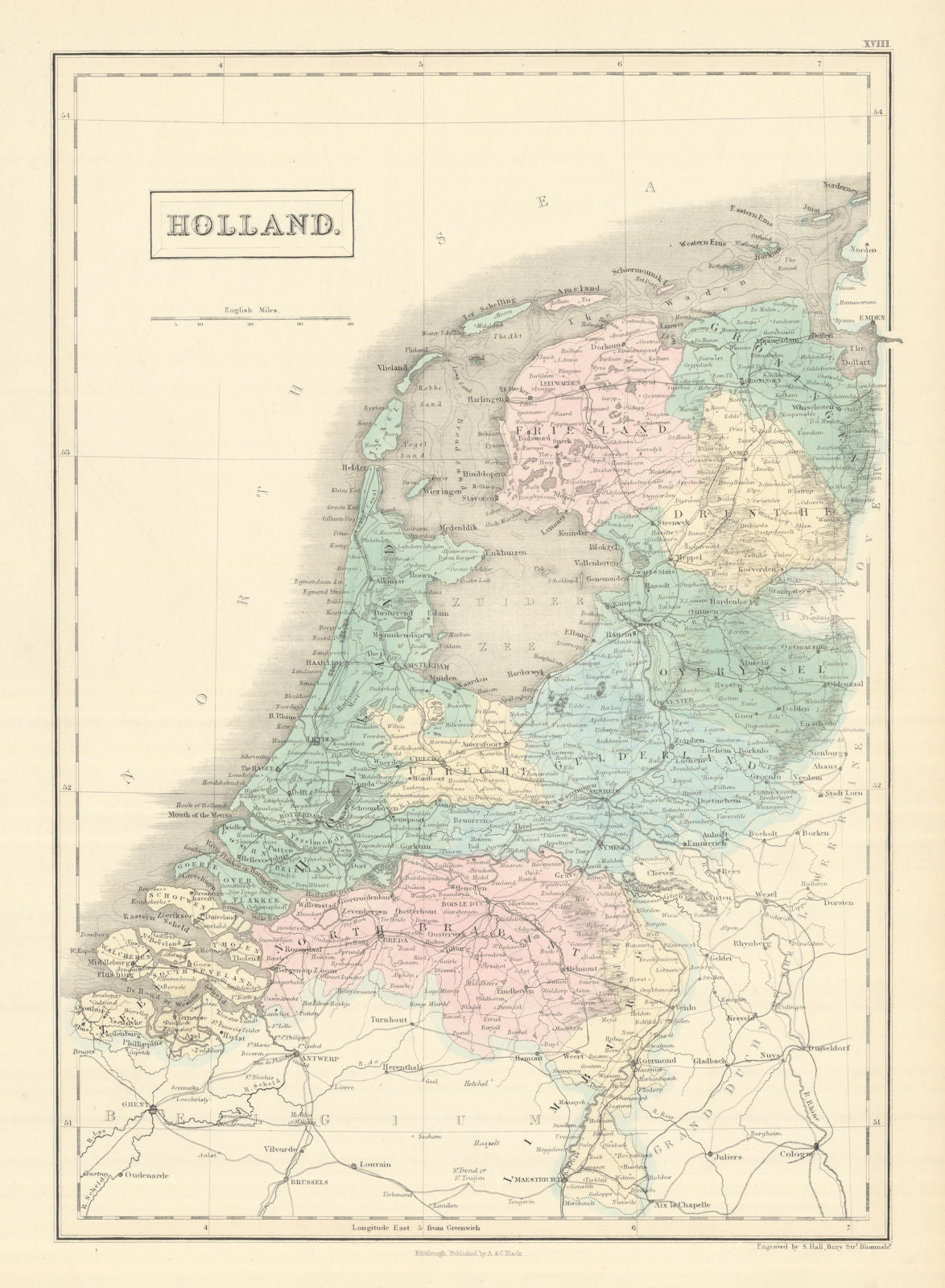 Sidney Hall (1788?-1831) engraved maps for William Faden, Aaron Arrowsmith, John Thomson and others. We stock his Irish county maps from "Ireland: Its Scenery, Character, &c" (1835) and atlas maps for the 8th edition of the Encyclopaedia Britannica (1860). He was succeeded by his wife Selina Hall (fl. 1831-1853) who continued the business under her husband's name; she signed her work "S. Hall", and her work is frequently ascribed to her husband.
