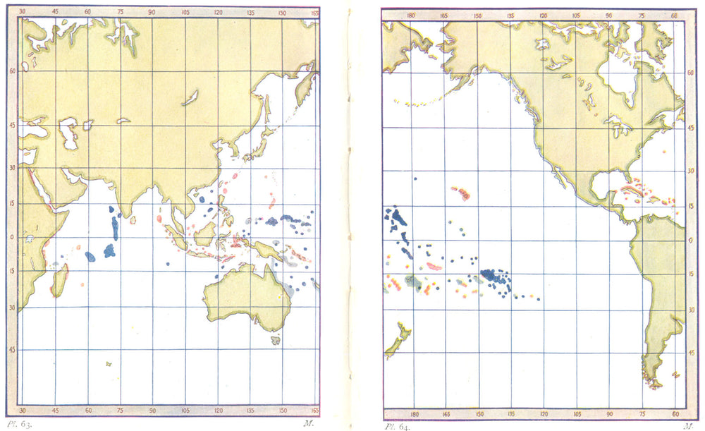 CORAL REEFS.Distribution.Dark Blue,Atolls.Light,Barrier.Red,Fringing 1936 map