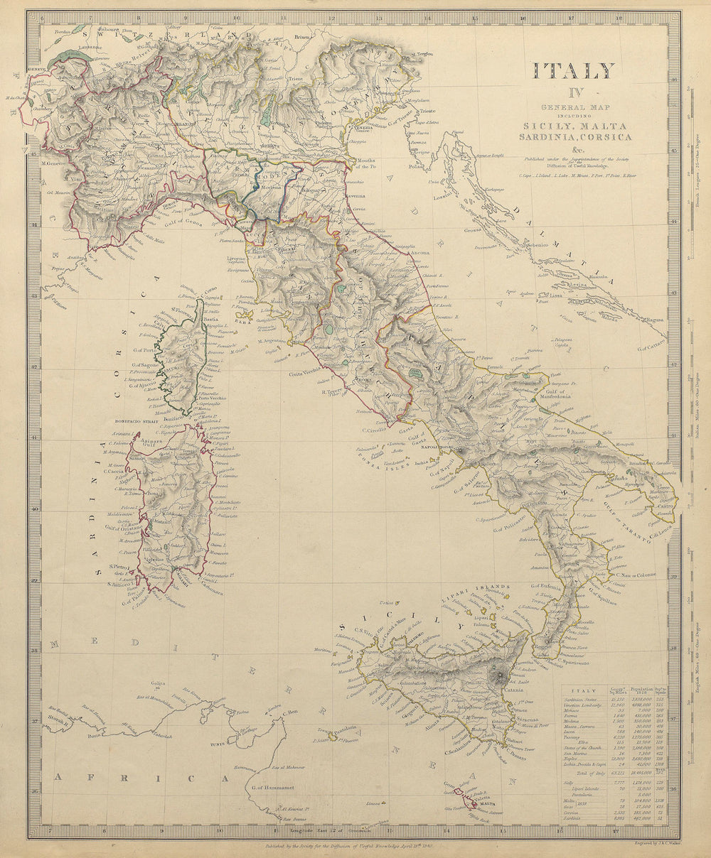 ITALY General Map Sicily Sardinia Corsica Malta. Population table SDUK 1844